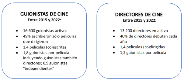 • El modelo de "cine de autor" sigue siendo dominante en el cine europeo: cerca de la mitad de los guionistas de cine teatral activos entre 2015 y 2022 solo escribieron películas que dirigieron. Sin embargo, el modelo es radicalmente diferente en la ficción para televisión y vídeo a la carta, donde la mayoría de los guionistas (91 %) escribieron para proyectos que no dirigieron.