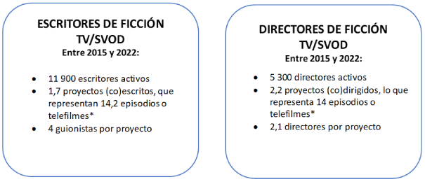 • Desde 2015, se ha observado un significativo aumento en la producción de series televisivas europeas y para plataformas SVOD, lo cual, de manera natural, ha resultado en que estos formatos sobrepasen a las producciones cinematográficas en lo que respecta a la asignación de trabajos de escritura y dirección. En el contexto de las series de TV/SVOD, cada encargo corresponde a una temporada completa, sin importar la cantidad de episodios que se escriban o dirijan.