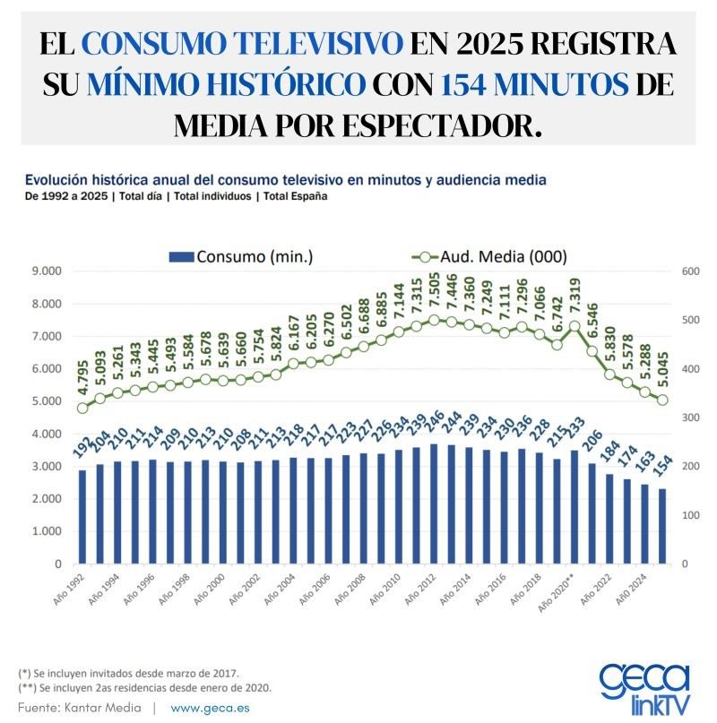 Los datos del  'Balance anual de audiencias de televisión 2025' publicados por la consultora GECA, confirman un hito histórico que redefine el panorama audiovisual: el tiempo medio que dedicamos a la televisión lineal ha caído a su nivel más bajo desde que existen registros. El consumo televisivo en 2025 registra su mínimo histórico con 154 minutos de media por espectador al día, lo que supone un descenso de 9 minutos respecto a los 163 minutos promediados en 2024.