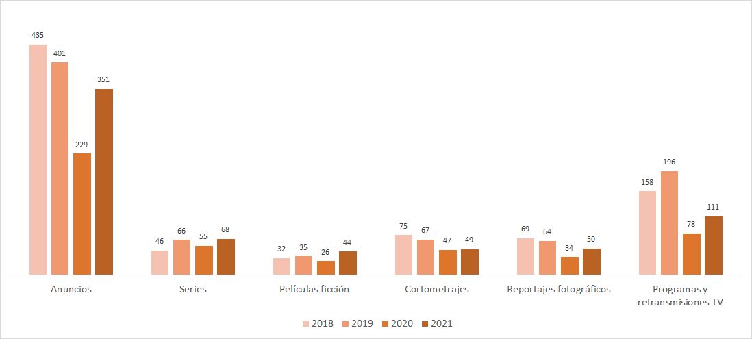 En el balance de 2021 destacan, a su vez, 44 largometrajes de ficción rodados en la ciudad, cifra igualmente superior a la registrada todos los años anteriores, incluidas las 35 identificadas en 2019, año en el que se había alcanzado la cifra más alta hasta la fecha. Este significativo aumento de más del 25% respecto a 2019 refleja la recuperación de la tendencia creciente identificada en años anteriores, si bien en parte también se explica por la concentración en 2021 tanto de los rodajes previstos para 2021 como de los que se vieron paralizados en 2020 y que, a diferencia de las series de televisión, han tardado más tiempo en reactivarse.
