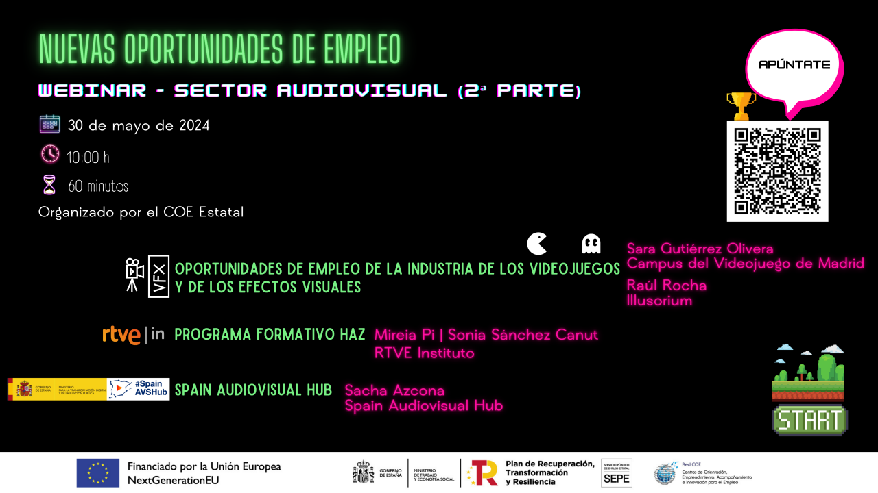 El COE Estatal en colaboración con el Ministerio para la Transformación Digital y de la Función Pública ha organizado este seminario web “Nuevas oportunidades de empleo en el sector audiovisual”, que tendrá lugar el jueves 30 de mayo, a las 10:00 horas. Se retransmite desde el Espacio de Encuentros del COE Estatal.